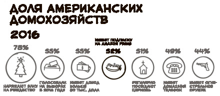 Источники: “Sizeable Gender Differences in Support of Bans on Assault Weapons, Large Clips”, Pew Research Center; ACTA, “The Vote Is In–78 Percent of U.S. Households Will Display Christmas Trees This Season: No Recount Necessary Says American Christmas Tree Association”, ACTA; “2016 November General Election Turnout Rates”, United States Elections Project; Stoffel, Brian. “The Average American Household’s Income: Where Do You Stand?” The Motley Fool; Green, Emma. “It’s Hard to Go to Church”, The Atlantic; “Twenty Percent of U.S. Households View Landline Telephones as an Important Communication Choice”, The Rand Corporation; Tuttle, Brad. “Amazon Has Upper-Income Americans Wrapped Around Its Finger”, The Time