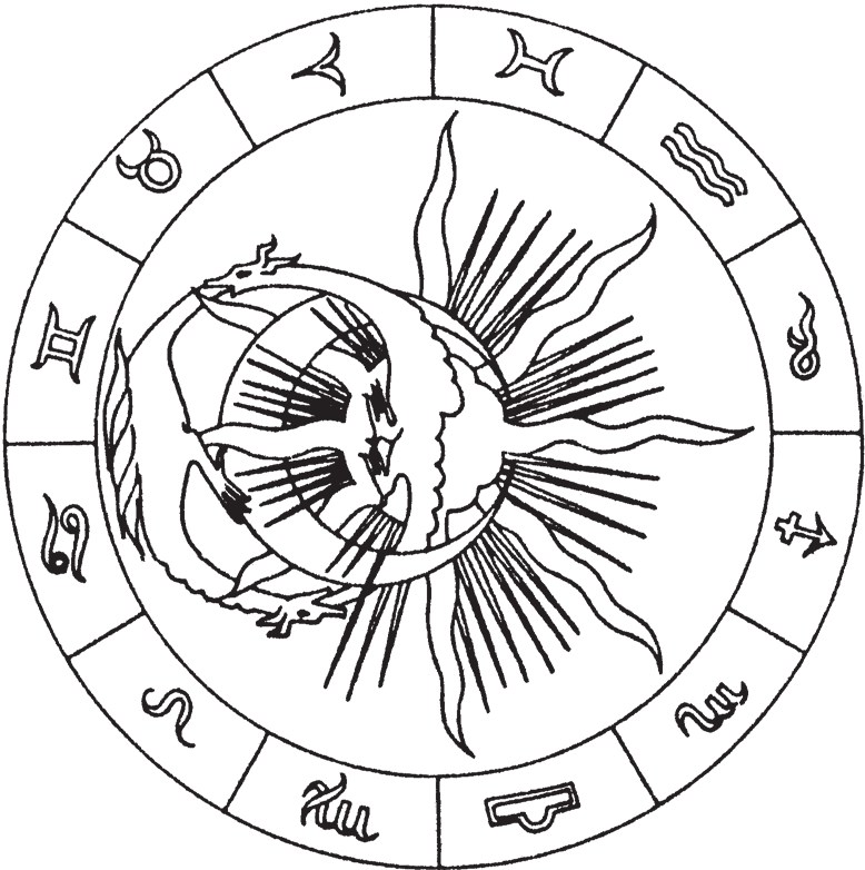 Каждая планета пребывает в двух «домах»: правый «дом» – мужской, левый – женский. Исключение – Солнце и Луна, имеющие только по одному «дому»; Солнце владеет мужской стороной зодиака, Луна – женской. Внизу, вокруг зимнего солнцестояния, в области смерти и тьмы, царит Сатурн, аналогичный свинцу в иерархии металлов. В знаке Сатурна полумесяц присоединен к нижней ветви креста – символ погружения сознания в материальный хаос. Сравним: в знаке Юпитера, аналогичного олову, полумесяц идет вверх от горизонтальной ветви – первый успех души в ее борьбе. Точно под горизонтальной ветвью зодиака находятся два «дома» Марса, и над ней – два «дома» Венеры. Соответственные знаки: Марс – крест над кругом, и Венера – крест под кругом. В первом случае (знак Марса и железа) дух скован и стянут телесностью, во втором (знак Венеры и меди) «солнце» духа восходит над крестовым древом материальных тенденций. Смутный проблеск золота. Ступенью выше – два «дома» Меркурия (ртуть, argentum vivum в иерархии металлов). Его знак единственный, включающий знаки Солнца и Луны, в его лунной «воде» таится огненный зародыш Солнца, как в душе – искра вселенского Духа. Для алхимиков argentum vivum – «мать золота» и главный инициатор (primum agens) магистерия. И наконец, на вершине зодиака – Солнце и Луна.