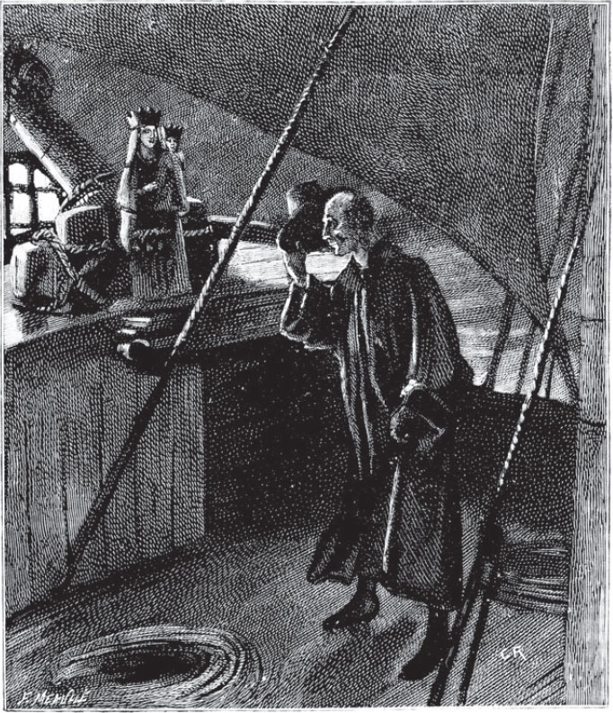 Эта похлебка напоминала собой «пучеро», но только говядину заменяла в ней рыба; провансалец бросал в кипящую воду горох, маленькие, нарезанные квадратиками ломтики сала и стручья красного перца, что было уступкой со стороны любителя bouillabaisse[39] любителям olla podrida[40]. Развязанный мешок с провизией стоял рядом с ним. Провансалец зажег у себя над головой железный фонарь со слюдяными стеклами, подвешенный на крючке к потолку камбуза. Рядом с фонарем болтался на другом крючке зимородок, служивший флюгером. В те времена существовало народное поверье, будто мертвый зимородок, подвешенный за клюв, поворачивается грудью в ту сторону, откуда дует ветер.