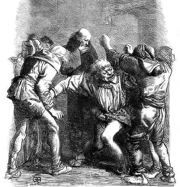 И тогда братство шутов, очнувшись от своего первоначального изумления, решило вступиться за своего столь внезапно развенчанного папу. Цыгане, арготинцы и вся корпорация судейских писцов, визжа, окружили священника.