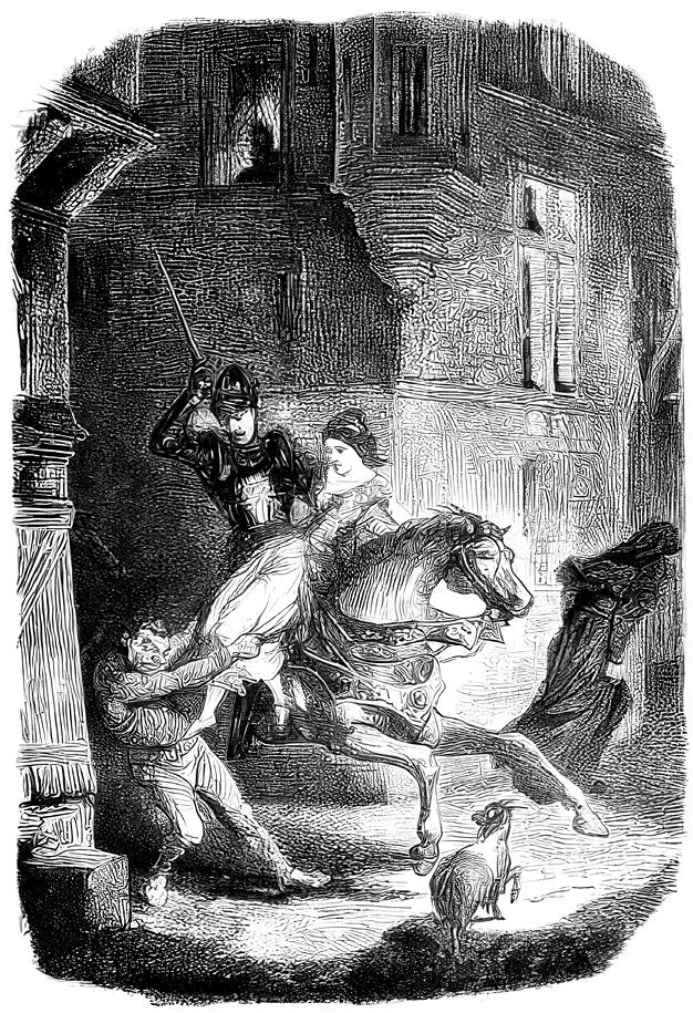Вырвав цыганку из рук ошеломленного Квазимодо, он перебросил ее поперек седла, и в ту самую минуту, когда опомнившийся от изумления ужасный горбун ринулся на него, чтобы отбить добычу, показалось человек пятнадцать-шестнадцать вооруженных палашами стрелков, ехавших следом за своим капитаном. То был небольшой отряд королевских стрелков, проверявший ночные дозоры по распоряжению парижского прево мессира Робера д’Эстутвиля.