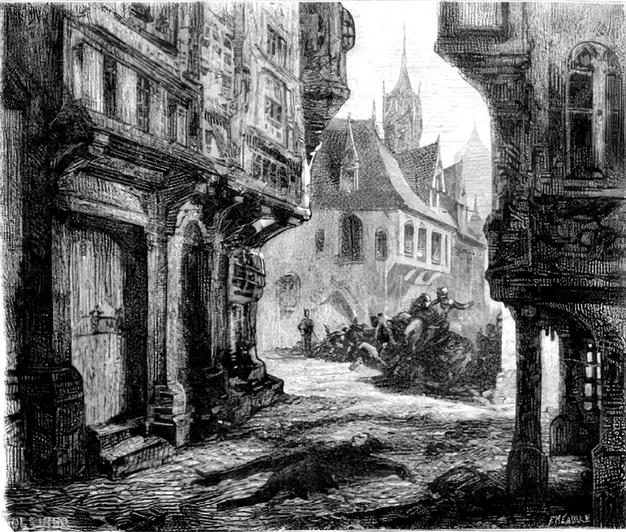 Это восклицание несколько облегчило его, а красноватый отблеск, который мелькнул перед ним в конце длинной и узкой улички, вернул ему мужество.