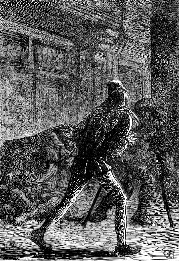 – Отчего мне так холодно? – спохватился он и только тут заметил, что лежит почти в самой середине сточной канавы. – Черт возьми этого горбатого циклопа! – проворчал он сквозь зубы и хотел приподняться, но был настолько оглушен падением и настолько разбит, что ему поневоле пришлось остаться на месте. Впрочем, руками он владел свободно; зажав нос, он покорился своей участи.