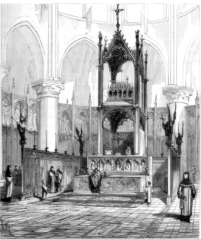 А кто подменил древний готический алтарь, пышно уставленный раками и ковчежцами, этим тяжелым каменным саркофагом, разукрашенным головами херувимов и облаками, похожим на попавший сюда архитектурный образчик церкви Валь-де-Грас или Дома инвалидов? Кто столь нелепо вделал в плиты карловингского пола, работы Эркандуса, этот тяжелый каменный анахронизм? Не Людовик ли XIV, исполнивший пожелание Людовика XIII?