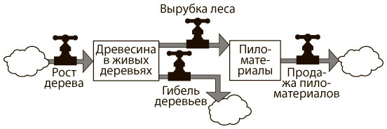 Объем древесины в деревьях – еще один пример запаса. Его входящий поток – рост деревьев. Исходящий – естественная гибель деревьев и вырубка леса. Вырубленные деревья становятся новым видом запасов, например стройматериалами на складе лесопилки. Его исходящий поток – продажа пиломатериалов клиентам.