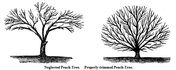 Observe a shoot of young peachwood, you will see near its base, leaf-buds. On the middle there are many blossom-buds, and on the top, leaf-buds again. The tendency of sap is to the extremity. Hence the upper leaf-buds will put out at once. And for their growth, and the maturity of the excessive fruit on the middle, the power of the sap is so far exhausted, that the leaf-buds at the base do not grow. Hence when the fruit is removed, nothing is left below the terminal shoots, but a bare pole. This is the condition in which we find most peach-trees.