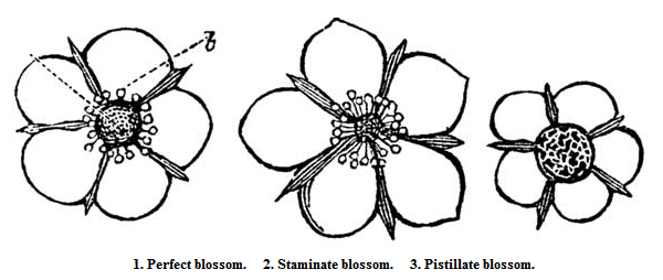 None of our small fruits are more esteemed, or more easily raised, and yet none more frequently fails. Failures always result from carelessness, or the want of a little knowledge of the best methods of cultivation. We omit much that might be said of the history and uses of the strawberry, and confine ourselves to a few brief directions, which, if strictly followed, will render every cultivator uniformly successful. No one need ever fail of growing a good crop of strawberries. In 1857, we saw plats of strawberries in Illinois, in the cultivation of which much money had been expended, and which were remarkably promising when in blossom, but which did not yield the cultivators five dollars' worth of fruit. In the language of the proprietors, "they blasted." Strawberries never blast; but, for the want of fertilizers at suitable distances, they may not fill. There are but three causes of failure—want of fertilizers, excessive drought, and allowing the vines to become too thick. Of most of our best varieties, the blossoms are of two kinds—pistillate and staminate, or male and female—and they are essential to each other. The pistillate plants bear the fruit, and the staminates are the fertilizers, without which the pistillates will be fruitless. There are three kinds of blossom—pistillate, staminate, and perfect, as seen in the cut.