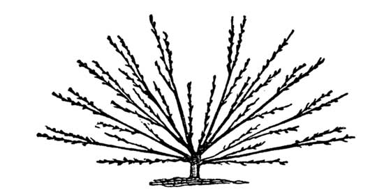 The following season, the two upper shoots are to be cut back to three buds, so as throw out one leading shoot, and one shoot on each side. The two lower shoots are to be cut back to two buds, so as to throw out one leading shoot, and one shoot on the upper side. In this second stage, you will have a tree with five leading shoots on each side (see cut, fan-training, 2d stage). These shoots form the future tree, and should neither be shortened in, nor allowed to bear fruit this year.