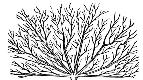 Each shoot should now be allowed to produce three shoots, one leading one, and two others on the upper side, one near the bottom, and the other half way up the stem. All others should be pinched off when they first appear. At the end of the third year you will have the appearance in the cut (Fan-training, third stage). After this it may bear fruit, but not too much, as a young tree so trained, is disposed to over-bearing. These shoots, except the leading ones, should be shortened back; but to what length depends upon the vigor of the tree. This is to be continued and extended as the grower may choose, always preventing the top from becoming too dense, and the shoot too long for a proper flow of sap, and maturity of fruit-buds. A good form, though slightly irregular, is seen in the cut (Fan-training, complete). Such trees trained against walls, or better, on trellis-work, are beautiful and very productive.