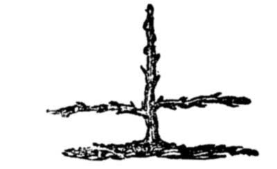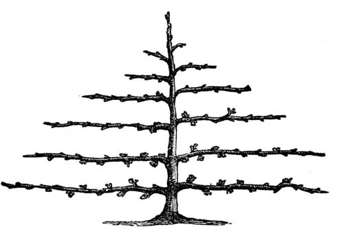 The next season several tiers of side branches will shoot out. The lowest should be left about eighteen inches from the ground, and by pinching off a part, others may be made to grow, at such distances as you may desire. At the end of the second year, the leader is headed back to increase the growth of the side shoots. The laterals will constantly increase, and you must save only a sufficient number. The third or fourth year, the lateral branches may be bent down and tied to stakes. The branches must be tied down from year to year, and the top so shortened in as to prevent too vigorous growth, and throw the sap into the laterals. This may be continued until the tree will exhibit the appearance in the cut (conical training complete). When the tree has become thoroughly formed it will retain its shape without keeping the branches tied. The fan and horizontal training are valuable for fruits that need winter protection, and they are also very ornamental, and enable us to cultivate much fruit on a small place. All these forms of training increase largely the productiveness of fruit-trees. It is recommended for all small gardens and yards, and will pay in growing fruit for market.