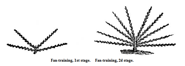 Fan-Training.—A tree but one year from the graft, or bud, is planted and headed down to within four buds of the ground, the buds so situated as to throw out two shoots on each side (see fan-training, first stage).