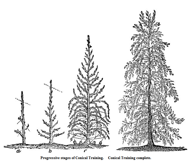Conical Training.—The Quenouille (pronounced kenoole) of the French, is the best of all forms of training, especially for the pear. To produce conical standards, plant young trees four or five feet high, and after the first year's growth, head back the top, and cut in the side branches, as in the cut (Progressive stages of conical training).