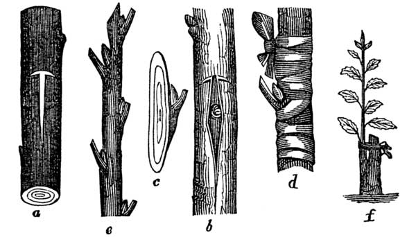 Bands.—The best yet known is the inside bark of the linden or American basswood. In June, when the bark slips easily, strip it from the tree, remove the coarse outside, immerse the inside bark in water for twenty days; the fibres will then easily separate, and become soft and pliable as satin ribbon. Cut it into convenient lengths, say one foot, and lay them away in a dry state, in which they will keep for years. This will afford good ties for many uses, such as bandages of vegetables for market, &c. Matting that comes around Russia iron and furniture does very well for bands; woollen yarn and candle-wicking are also used; but the bass-bark is best. After ten days the bands should be loosened and retied; then, if the bud is dried, it is spoiled, and the tree should be rebudded in another place; at the end of three weeks, if the bud adheres firmly, remove the band entirely. Better not bud on the south side; it is liable to injury in winter. In the spring, after the swelling of buds, but before the appearance of leaves, cut off the top four inches above the bud; when the bud grows, tie the tender shoot to the stalk (growing bud in cut, f). In July, cut the wood off even with the base of the bud and slanting up smoothly.