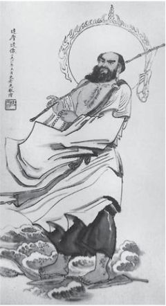 Foto 4: Bodhidharma (auf chinesisch Da-mo, auf japanisch Daruma) überquert den Jangtse-Fluß auf einen Schilfrohr. Eine von zahlreichen modernen Darstellungen dieser Episode, wie man sie in den Tempeln Südchinas finden kann.