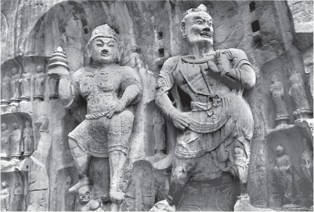 Foto 2: Die ersten Anfänge entwickelten sich höchstwahrscheinlich im alten Indien. Die riesigen Steinwächter am Eingang zur großen Höhle der Longmen-Grotten in der Nähe von Lo-Yang (China) nehmen verschiedene Haltungen aus der Vajramukti-Kampfkunst ein, die einst durch die Kriegerkaste des alten Indiens praktiziert wurde. Diese Positionenfinden sich gleichermaßen in japanischen Götterstatuen (Devas) und in Figuren der Tempelwächter im mittelalterlichen Japan (Kongo-Rikishi) wieder. Auch in der alten Kampkunst der Mönche des berühmten Shaolin-Tempels lassen sich diese Körperhaltungenwiederfinden. Dieser Tempel liegt an einer von Indien nach China führenden Pilgerstraße, über die im übrigen auch der Chan-Buddhismus nach China gelangt ist.