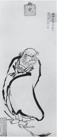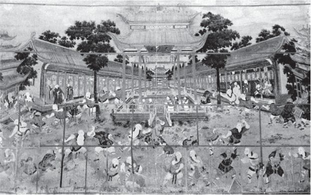 Foto 6: Bodhidharma lehrt im Shaolinkloster die „18 Hände des Lo Han“, Techniken, die als Grundlage aller chinesischen Kampfkünste angesehen werden. Auf den Mauern der Baiyi-Halle des heutigen Klosters kann man noch immer ein eindrucksvolles Fresko bewundern, das Mönche beim Training zeigt (siehe auch S. 48 ff.)