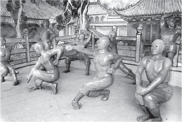 Foto 8: Statuen in Menschengröße, die die einst im Shaolinkloster praktizierten Kampfkünste repräsentieren. Von ihnen existieren einige Dutzend in einem der Höfe des heutigen Klosters. Bereits ein oberflächlicher Vergleich genügt, um die enge Verbindung zwischen den im Bubishi beschriebenen und den Shaolin-Techniken zu erkennen.