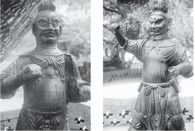 Fotos 10 und 11: Die „Metallmänner“ von Jinci in der Provinz Shan Xi (China). Diese insgesamt sechs Gußstatuen in Menschgröße, von denen zwei aus dem 11. Jahrhundert stammen, stellen (ursprünglich bewaffnete) Krieger dar. Sie sind jüngere Versionen der „Terrakottakrieger“, die in der Grabstätte des Kaisers Huang-Ti gefunden wurden.
