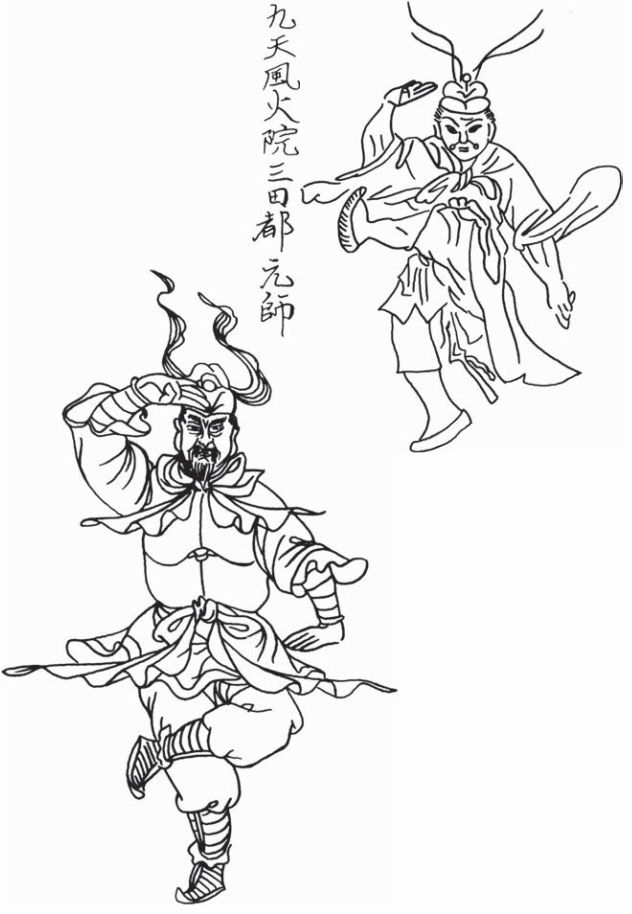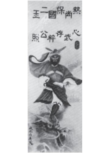 Foto 9: Zahlreiche Kampfkunstexperten aus Okinawa reisten nach China, um dort ihr Wissen über den Kampf mit bloßer Hand zu vervollkommnen. Für gewöhnlich gelangten sie zuerst in die Okinawa gegenüberliegende Provinz Fujian (Fukien). Einer der Reisenden, Matayoshi Shinkô (1888 - 1947), brachte von seiner ersten Fahrt nach Fuzhou nicht nur eine Kopie des Bubishi, sondern ebenfalls diese Grafik mit, die eine Kriegergottheit aus dem alten Zheng Li (der Name von Fujian im Altertum) darstellt. Es ist vorstellbar, daß es sich hierbei um eine andere „Version“ der Darstellung einer Wächter- und Schutzgottheit aus der Provinz Zheng Li (Jiu Tian Feng Huo Yuan San Tian Dou) handelt, die später von Fang Jin Jang, der Schöpferin des Kampfstils des Weißen Kranichs (Hequan) zur Schutzgottheit ihrer Schule erwählt wurde. Diese Göttergestalt erscheint ebenfalls in dem Bubishi-Exemplar, das sich im Besitz Mabuni Kenwas, des Gründers des Shitô ryû, befand. Ebenfalls auffällig auf dem Bild von Matayoshi Sensei ist die Anwesenheit eines Drachen – zweifelsohne eine Anspielung auf den „Neun-Drachen-Tempel“. Dessen Existenz konnte zwar nie bewiesen werden, doch die Legende behauptet, er sei der Shaolin-Tempel des Südens gewesen, der im Chiu-Lung-Gebirge gestanden haben soll, unweit der Stadt Fuzhou in der Fukien-Provinz. Manche Quellen besagen, daß es die dortigen Lehren gewesen seien, die im Bubishi verschlüsselt wiedergegeben wurden. (Quelle: Ogura Tsuneyoshi)