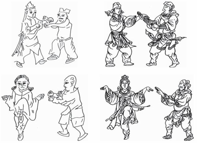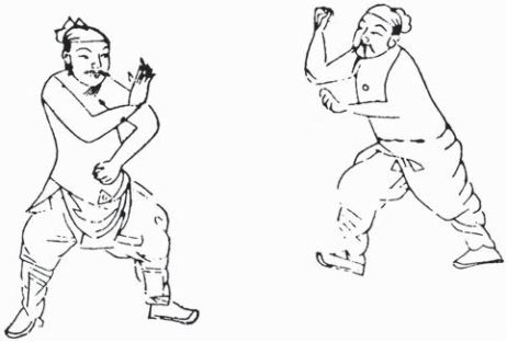 Alte chinesische Grafik, die zwei Jiaoli-Kämpfer darstellt. Diese Kampfkunst läßt sich bis in die Zeit der Streitenden Reiche (475 - 221 v. Chr.) zurückverfolgen.
