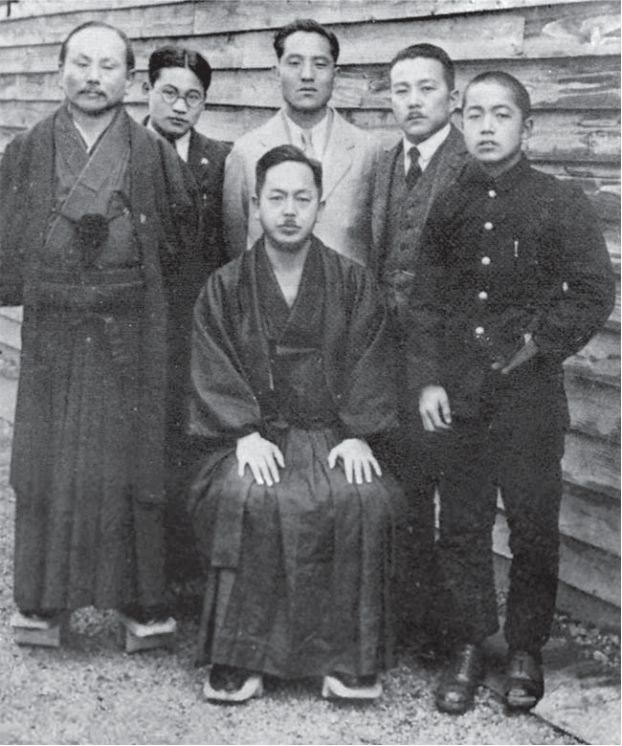 Foto 12: Zu den Erben der alten Techniken aus dem Bubishi zählt wahrscheinlich die gesamte Generation der Kampfkunstexperten des Okinawa te. Ihnen ist zu verdanken, daß die Kunst der „leeren Hand“ von China nach Japan gelangte. Sie alle schöpften aus derselben Quelle und waren einander oft viel näher, als die gegenwärtige Zersplitterung des Karatedô in unterschiedliche Stilrichtungen vermuten läßt. Sitzend in der Mitte Mabuni Kenwa, der Gründer des Shitô ryû. Stehend von links nach rechts: Funakoshi Gichin (1869 - 1957), der Gründer des Shôtôkan ryû, Nakasone Genwa (1895 - 1978), unbekannt, Konishi Yasuhiro (1893 - 1983), der Gründer des Shindô Jigen (Shizen) ryû, Mabuni Kenei (geb. 1918), der älteste Sohn Mabuni Kenwas und gegenwärtige Vorstand des Shitô ryû. Die Fotografie stammt aus dem Jahr 1930.