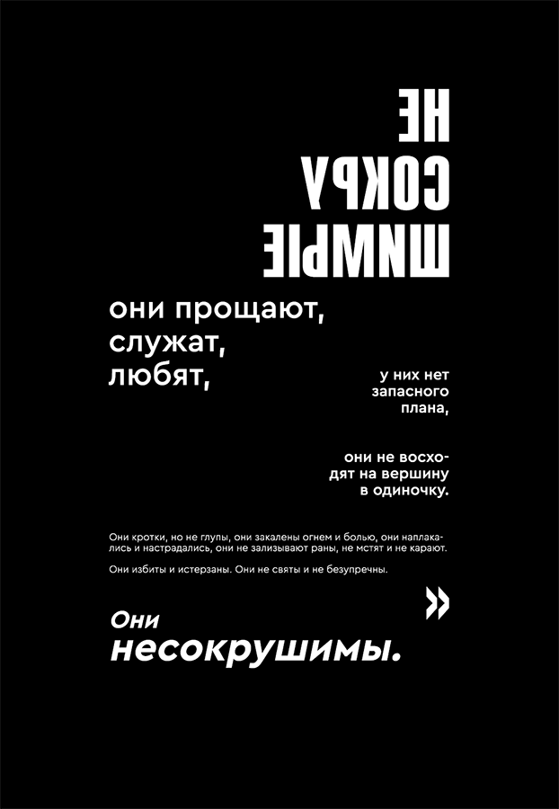 Мы заново откроем тот бесконечный потенциал, который заключен в вас, в вашей уникальности, в том, что отличает вас от всего сущего в безмерном космосе. Мы докажем, что мы и есть Несокрушимые.