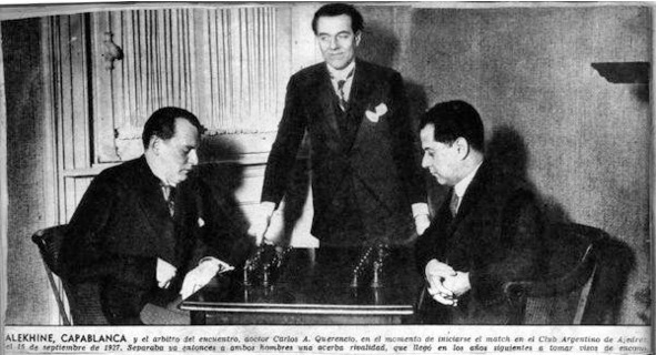 И вот, настал день открытия матча, 15 сентября 1927 года. Хосе Рауль был в прекрасном, идеально подогнанном по его статной фигуре, черном костюме. Его мягкие движения и обаятельная улыбка вызывали всеобщее восхищение. А Алехин… он тоже неплохо выглядел, но был немного скован, не знал, куда девать руки. Да и вообще, кто может сравниться с великолепным и неподражаемым доном Хосе? Когда настал момент жеребьевки, президент зажал в кулаках две пешки и предоставил возможность выбора чемпиону мира. Капабланка плавно дотронулся до левого манжета президента, и в раскрытой ладони оказалась белая пешка. Ничего удивительного, он всегда был счастливцем. Это был хороший знак – начинать первую партию матча белыми. Капабланка был спокоен и уверен в себе. Ему всего тридцать девять, он в прекрасной форме, а своего противника он уже не раз побеждал в личных встречах на турнирах. Вот почему, когда президент обнял обоих противников после жеребьевки и сказал: «Завтра за работу, сеньоры!», Хосе Рауль ответил: «Мне работать не нужно. Пусть сеньор Алехин трудится!».