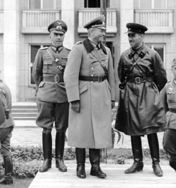 Генерал Гудериан и комбриг Кривошеин во время передачи города Брест-Литовска (ныне г. Брест, Белоруссия) частям РККА. Слева – генерал Мориц фон Викторин.