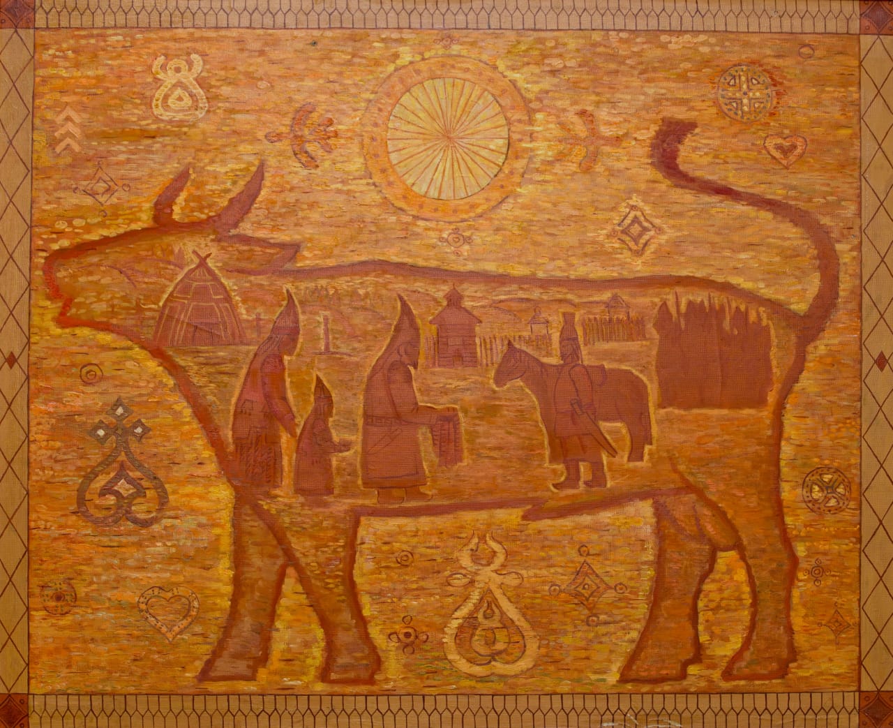 Взгляд его простирается вдоль всего неба и он видит, что нижние края небес по окружности свисают вниз. Свисают как бахрома, подобно серебряным ожерельям они трутся о приподнятые края земли, со звуком как будто грызутся со скрежетом разъяренные жеребцы. По обратной стороне этого неба пасутся несметные стада, курятся дымом в далеком тумане белые юрты. Как только пролетел он одно небо, появилось другое небо, другое по цвету. Затем еще одно небо, еще и еще– всего девять ярусов. И когда Платон достиг вершины дерева, увидев теплый и божественный свет- он неожиданно проснулся.