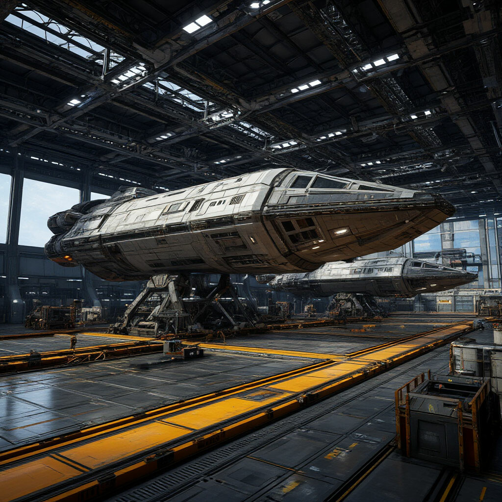 Портальные краны, поддерживающие корабли, переплетения топливных шлангов и застывшие манипуляторы дополняли этот пейзаж.