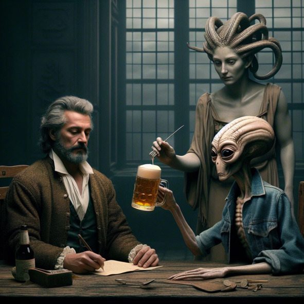 Я также обращаю внимание на то, что очень часто кто-то из присутствующих использует эти приспособления по своему конкретному назначению. Постоянно слышны неприятные звуки от возвращения пищи и жидкости обратно на улицу. И мне приходит в голову мысль, что оркестр есть, А музыки не слышно. Я смотрю на футуристическую музыкальную группу. Они раздувают инструменты, и это видно. Певица открывает рот перед каким-то странным микрофоном, но звука нет. В зале слышны отрывочные фразы и, конечно же, те уже упомянутые звуки. Случайно кто-то с качелями выходит из паба, чтобы его заменил новый посетитель. Начинаю медленно и сосредоточенно рассматривать пируююших с интересом того, кто должен будет их описать. Трудная задача – описать человеку такие гротескные и уродливые конфигурации, которые перемещаются, разговаривают и потребляют. Наверное, они не считают себя такими, какими я их квалифицирую. Даже меня, конечно, принимают за очередного мутанта, вырождающегося из какого-то радиационного или вирусного штамма. Я должен спросить.: