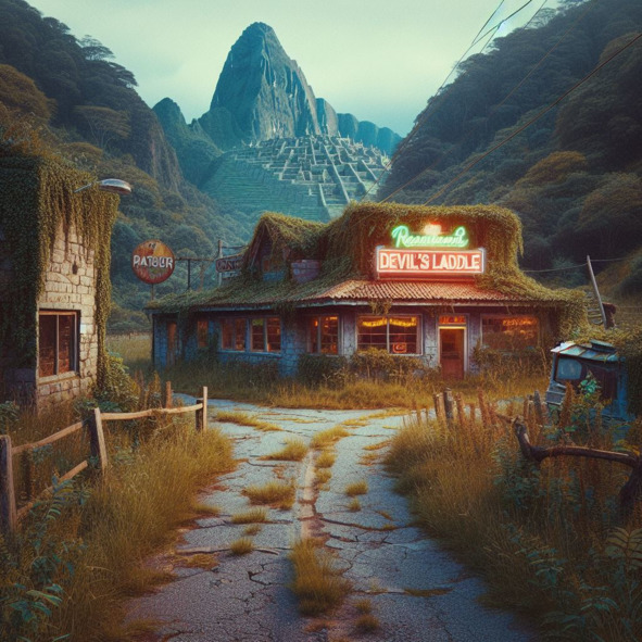 На этот раз мы идем по какой-то асфальтированной дороге, и уже видно здание ресторана, которое имеет даже светящуюся неоновую надпись: «Ковш Дьявола». Со стороны видны несколько дворцов, похожих на зевсовский, а сзади вижу пирамиду, похожую на Мачу-Пикчу. Я как раз собирался спросить, когда Данте нагло звонит, зная что это меня раздражает. Про чтение мыслей – это мое слово.: