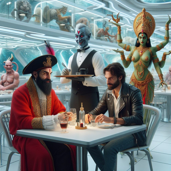 Я думаю, что многое здесь происходит только с мыслями. К Зевсу Прометей явился при упоминании его имени, а тут я только подумал о чертях, и вот этот притащился. Хорошо, что по крайней мере он не был грубым по традиции. А Калли прямо засунулась в наш стол, вытащил стул из соседнего, где сидели три Валькирии и села между нами с Данте: