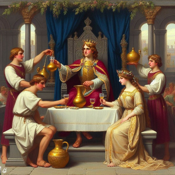 Царь Петр Первый дважды хлопнул руками и вошли две красавицы. Одна носит поднос с двумя серебряными потирами, а другая держит позолоченный ритон, полный вина.