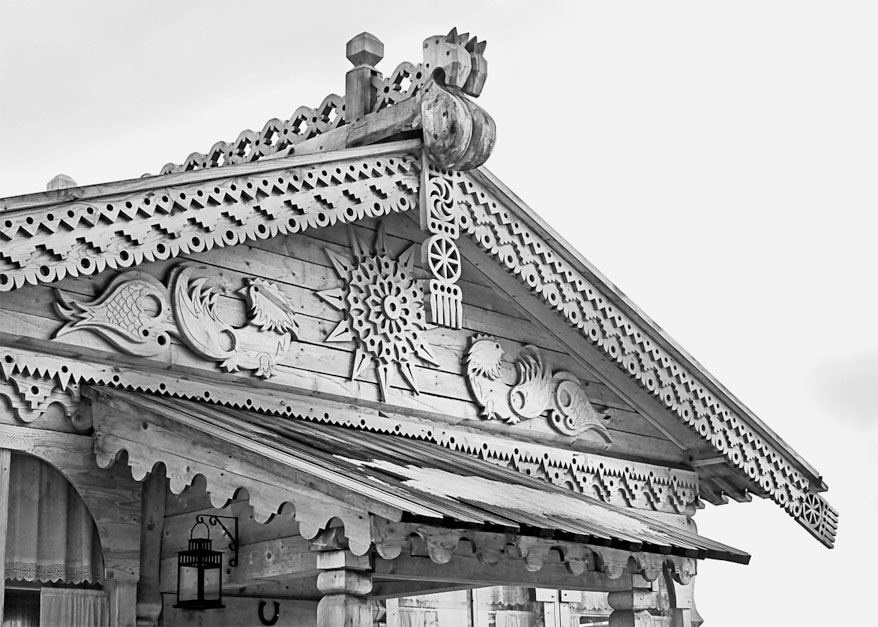 Обережные символы на домах жителей восточно-европейской платформы имеют очень древние и глубокие корни. В России на крыше дома всегда присутствовал солярный знак в виде коня, символизирующего солнце. Поэтому исстари эта часть кровли называется коньком. А на фронтоне присутствует реальное изображение солнца или его символа. На центральном «полотенце», спускающемся с конька, расположена свастика Перун (круг, поделенный на 6 секторов). Перун – это символ Рода, защищающий дом от всех громов и молний, как небесных, так и человеческих.