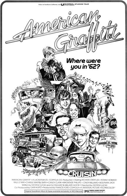 Афиша второго полнометражного фильма Джорджа Лукаса «Американские граффити». Слоган к фильму: «А ты где был в 1962-м?»