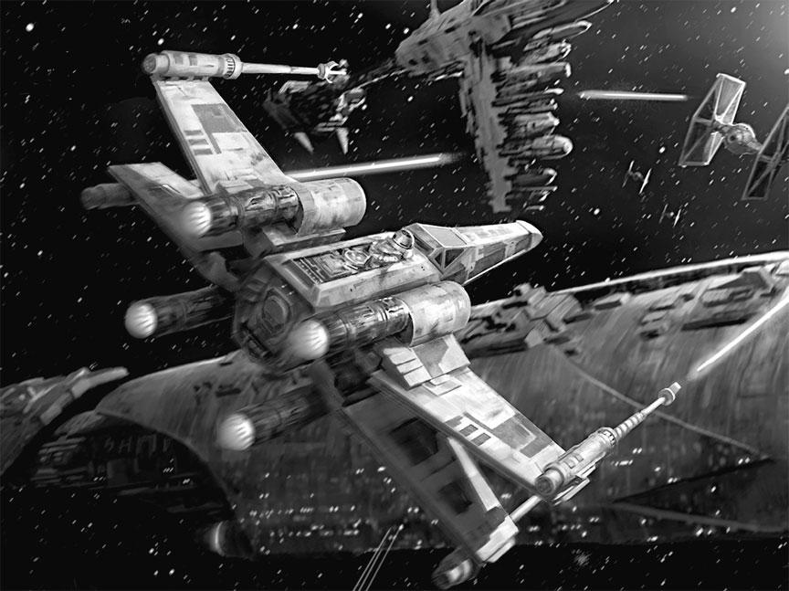 Кульминационный эпизод фильма – «Атака на Звезду Смерти» – сперва возник в виде картины. Маккуорри изобразил повстанческие истребители в траншеях – в те времена еще с гладкими стенами и с пушками на дне. Боевые сцены с множеством лазерных лучей сильно впечатлили создателей моделей. Но одной картины оказалось недостаточно. Она передавала дизайн, но не динамику.