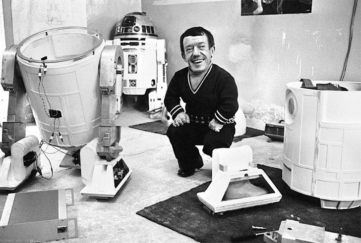 Кенни Бейкер и астромеханический дроид R2-D2, созданный незадолго до 32 до я. б. R2-D2 был сыгран Кенни Бейкером во всех шести фильмах «Звездных войн», а также во многих эпизодах использовалась механическая или смоделированная на компьютере модель