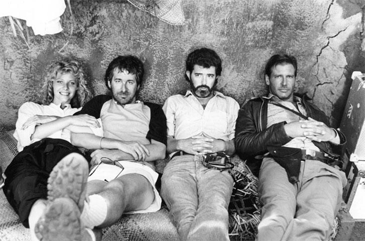 Кейт Кэпшоу, Стивен Спилберг, Джордж Лукас и Харрисон Форд на съемках фильма «Индиана Джонс и храм судьбы»