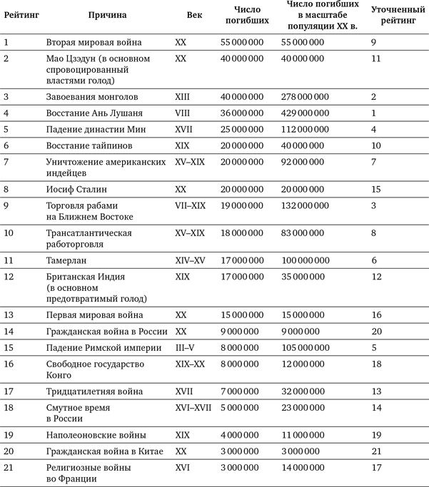 Прежде всего спрошу: о всех ли этих войнах вы слышали раньше? (Я – нет.) И еще – знаете ли вы, что Первой мировой войне предшествовали пять войн и четыре резни с бо́льшим количеством жертв? Я подозреваю, что многие читатели с удивлением обнаружат, что из 21 самого (известного нам) смертоносного события, которые устраивали люди, 14 случились до XX столетия. И это если считать в абсолютных цифрах. Если же считать в процентах к размеру популяции, то лишь одна из катастроф XX в. попадает в первую десятку. Самым же смертоносным катаклизмом всех времен и народов был мятеж Ань Лушаня вместе с последовавшей за ним восьмилетней гражданской войной, случившиеся в Китае во времена династии Тан. Согласно переписи населения, тогда погибло две трети жителей Китая – шестая часть населения Земли.