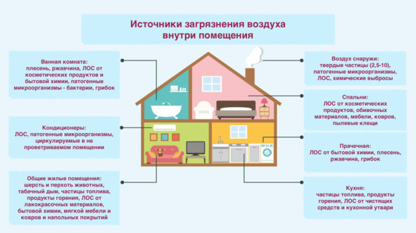 Внутреннее пространство, в котором проживает один или несколько человек, автоматически загрязняется. К распространенным в воздухе загрязнителям относятся химические вещества и газы, пыль, перхоть, пылевые клещи, споры плесени, пыльца, бактерии и вирусы. Распространенные бытовые товары и строительные материалы загрязняют воздух летучими органическими соединениями (ЛОС), формальдегидом, свинцом и асбестом.