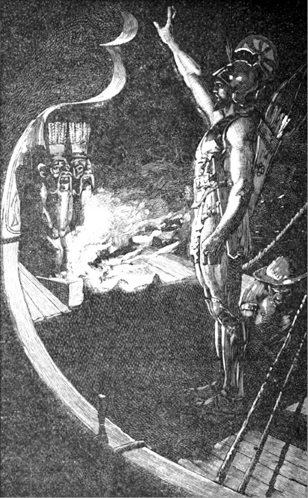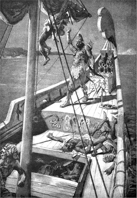 – Да, нужен! – крикнул ему Скиталец. Лодка подплыла, моряк с факелом в руке поднялся на корабль, но, увидев мертвецов на палубе, висящего на рее матроса, привязанного к железной балке капитана, а главное – золотые доспехи героя, вонзившийся в гребень шлема наконечник копья и грозное лицо Одиссея, он в ужасе отпрянул, словно увидел самого бога Осириса, приплывшего к ним на корабле мертвых. Но Скиталец стал его убеждать, что бояться ему нечего, он везет на корабле богатый груз и драгоценные дары для фараона. Все еще дрожа от страха, проводник взял в руки кормило и искусно провел корабль между полыхающими громадами в спокойные воды египетской реки. Скиталец стоял возле мачты и пел песню Лука, и пламя ослепительно играло на его золотых доспехах.