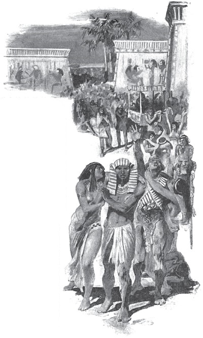 Они подошли к бронзовым воротам между пилонами, за которыми находился двор храма. Здесь уже собралась тысячная толпа. Пока они разглядывали толпу, к воротам подошел жрец – тот самый, что показывал Скитальцу трупы в бронзовых ваннах. Он выглянул за решетку ворот и провозгласил:
