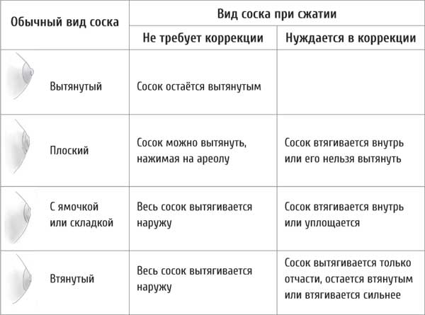 Первым делом посмотрите на оба соска. Они могут быть вытянутыми или западающими внутрь, или же один из них либо оба могут оказаться плоскими, на них могут быть ямочки, складка в середине соска. Затем проведите «щипковый» тест. Осторожно сожмите грудь большим и указательным пальцами сразу за соском. Так вы имитируете движение, которое будет делать сосущий ребенок. Посмотрите, как реагируют на это оба соска. Если они плоские, вытяните их, чтобы проверить, способны ли они приподняться, отставая от внутренних частей груди. Таблица на стр. 41 поможет вам понять, надо ли предпринимать еще какие-то шаги, чтобы минимизировать проблемы в начале кормления.