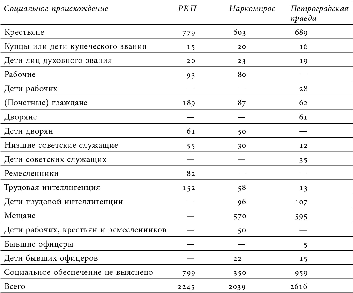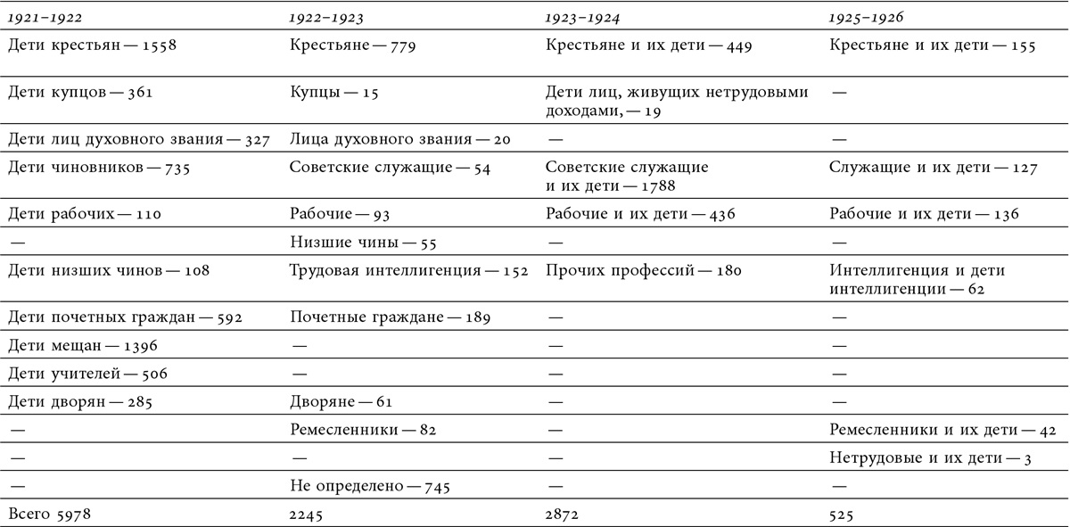 Советские социологи определяли класс как «совокупность» людей с одинаковым отношением к средствам производства[239]. Но как определить классовую идентичность конкретного, отдельно взятого человека? В 1921 году ректор ПГУ в письме просил уполномоченного по делам петроградских вузов И. Невского дать указания местным комиссиям, как проводить в жизнь классовый отбор, «какими реальными данными руководствоваться, оценивая классовую физиономию кандидата»[240]. По партийной статистике начала 1920‐х, очевидны огромные трудности с классификацией социальной сущности студентов. Сборная солянка из сословных и профессиональных категорий превращалась в упорядоченный строй очень медленно. Протоколы приемной комиссии Томского государственного университета в 1921 году учитывали «сословие» («мещане», «крестьяне», «казаки», «почетные граждане», «разночинцы») и «род занятий» («учащиеся», «канцелярская работа», «физическая работа», «техническая работа», «педагогическая работа», «смешанная»)[241]. В Петроградском государственном университете неразберихи было еще больше.