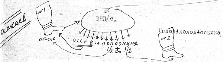 Ты можешь возразить, – продолжал Пархомов, – что в партию двери узки, не возражаю, лишь добавляю, что с партией дверь широкая и по ней все время свежая тропа, протоптана рабочим сапогом № 2 [см. схему]». «Автор печется о здоровье партии, о том, что из нее вычищают лучших – при узости двери обратно, что вычищенных ждет «голод + холод + ссылка», что половина оппозиции и отсеянных возвращается в партию, но другая идет в лагеря и политизоляторы». «Но кто в эту узкую дверь стремится проскользнуть, хотя бы даже с мылом, кого в эту дверь тянет магнит ста привилегий, не выдвиженца ли рабочего, не крестьянина ли от сохи, не грубого ли мужика, который не умеет выслужиться, не рабочего, который не хочет выслуживаться, а кого же все-таки тянет? Тянет служащего, который весьма вежлив, осторожен и услужлив на все 100%. Может, это клевета с моей стороны, просто по злобе, так опровергните, дорогие товарищи. На основании ваших же материалов, которые вы так искусно подбираете, и даже несмотря на такую искусность, <…> вам не опровергнуть сказанного, не опровергнуть жизненных фактов. Стоп, довольно, ибо мало того, что ошибки подмечать, надо и предлагать меры, как их изжить, а в настоящее время я пока к этому второму ответу еще не вполне созрел.