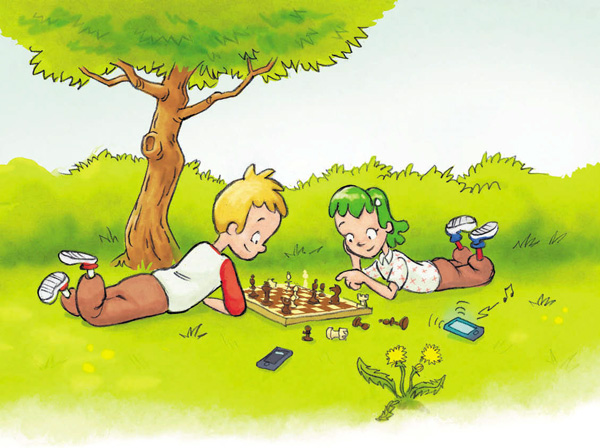 Тринь! Трень! Маркусу и Марианне одновременно пришли сообщения. Шахматная партия была в самом разгаре, и детям не хотелось отвлекаться на телефоны, лежащие рядом в траве. Позади ребят стояла газонокосилка, но скошен был лишь маленький квадратик газона.