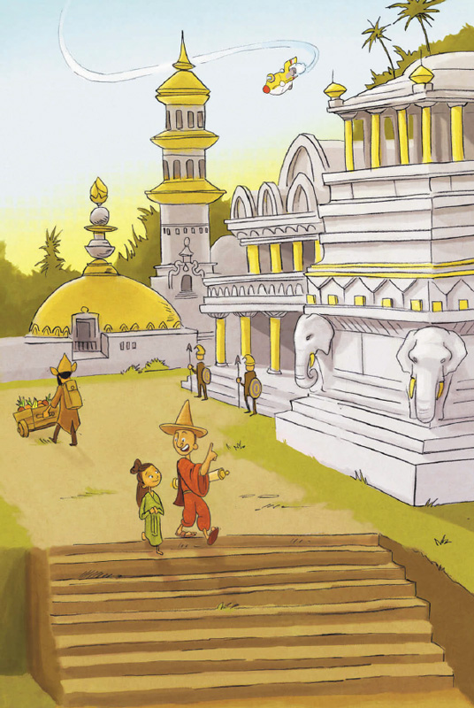 Рано утром Лунник достиг Индии. Дядя Альберт плавно посадил ракету на рисовом поле. Вдалеке виднелись силуэты города.