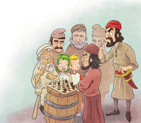 – Эта игра называется «Шатрандж», – шёпотом начал объяснять дядя Альберт. – Она ещё больше похожа на современные шахматы. Но фигура, которую мы называем королём, называется здесь «шахом». Думаю, господин в чалме решил, что ты советуешь человеку, играющему чёрными, подвинуть своего шаха. Он ведь и правда под угрозой.