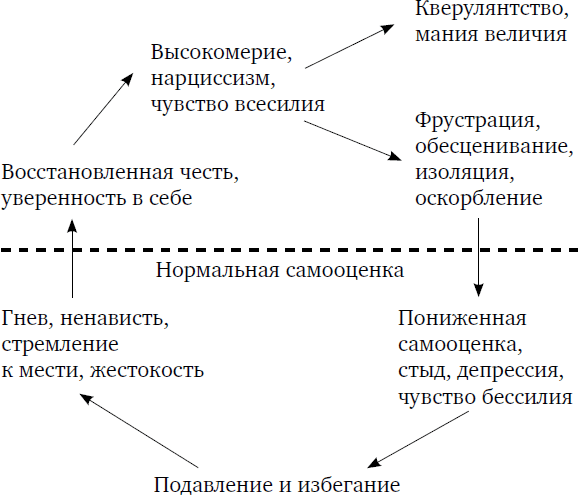 На пике эмоций это может привести к агрессии, человек будет пытаться восстановить потерянную честь и самоуважение. Когда стремление компенсировать негативные последствия оскорблений переходит все границы, это заканчивается проявлениями высокомерия и нарциссизма. В результате цикл оскорблений, оскорбленности и разочарований начинается заново, затрагивая все новых людей и продолжаясь бесконечно.